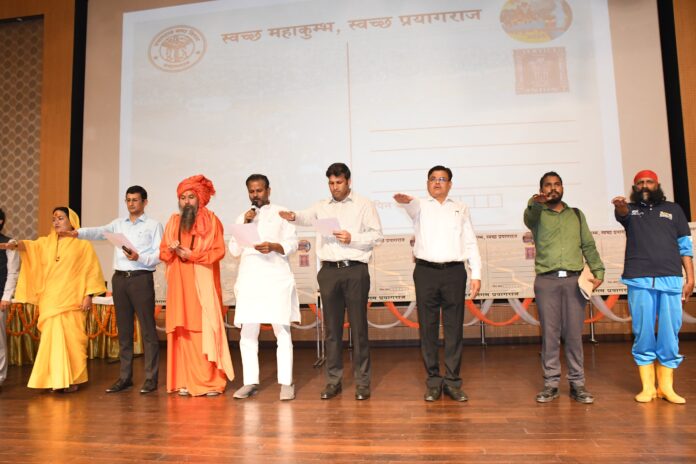 महाकुम्भ-2025 के दृष्टिगत स्वच्छ कुम्भ, स्वच्छ प्रयागराज एवं प्लास्टिक मुक्त स्वच्छ महाकुम्भ की अवधारणा को मूर्त रूप दिए जाने हेतु ‘‘आगाज’’ (प्लास्टिक मुक्त स्वच्छ महाकुम्भ का प्रतिबद्ध-परित्याग-प्रतिबन्ध प्लास्टिक) कार्यक्रम का आयोजन महानिर्वाणी अखाड़ा के पूज्य संत श्री यमुनापुरी जी महाराज, किन्नर अखाड़ा की महामण्डलेश्वर कौशल्यानंद गिरि, माननीय महापौर उमेश चन्द्र गणेश केसरवानी, मण्डलायुक्त विजय विश्वास पंत, जिलाधिकारी रविन्द्र कुमार माँदड़, नगर आयुक्त चन्द्र मोहन गर्ग, मुख्य विकास अधिकारी गौरव कुमार एवं अन्य स्टेक होल्डर्स की उपस्थिति में बुधवार को इलाहाबाद मेडिकल एसोसिएशन के हॉल में हुआ एवं कार्यक्रम के माध्यम से उपस्थित लोगो को स्वच्छता का संदेश दिया व सिंगल यूज प्लास्टिक का पूर्णतः परित्याग किए जाने के साथ अन्य लोगो को भी इसके लिए प्रेरित करने के लिए कहा गया।