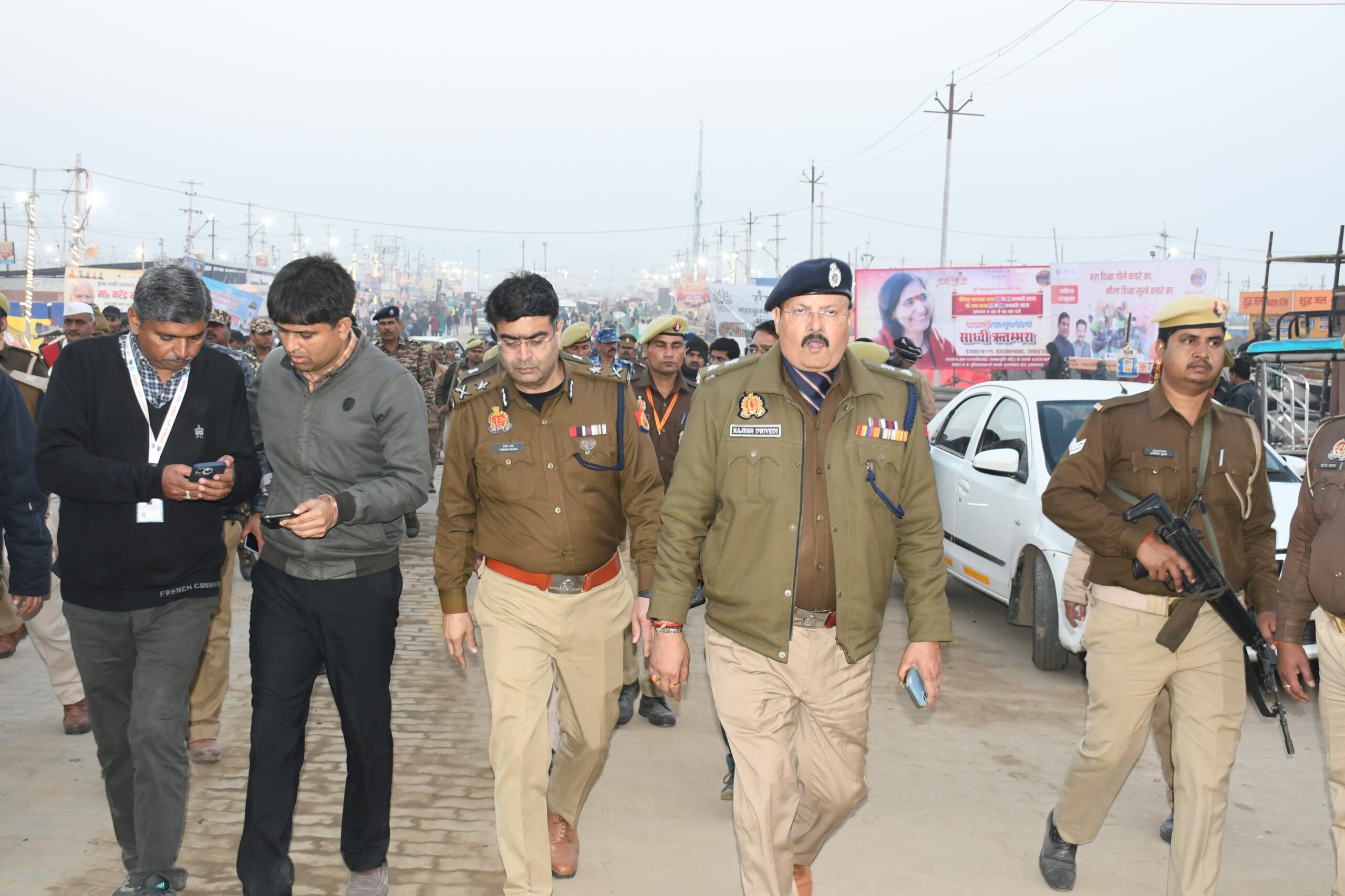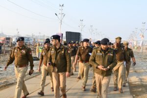 महाकुम्भ-2025 के दिव्य भव्य सकुशल एवं सुरक्षित आयोजन एवं आगामी स्नान पर्व को दृष्टिगत रखते हुए अपर पुलिस महानिदेशक प्रयागराज जोन,प्रयागराज, पुलिस आयुक्त कमिश्नरेट प्रयागराज, पुलिस महानिरीक्षक प्रयागराज परिक्षेत्र, मंडलायुक्त प्रयागराज, पुलिस उप महानिरीक्षक महाकुम्भ, मेलाधिकारी एवं वरिष्ठ पुलिस अधीक्षक महाकुम्भ के द्वारा अर्ध सैनिक बल के जवानों के साथ अखाड़ा क्षेत्र में शाही स्नान के रुट व्यवस्था का भ्रमण करते हुए पाण्टून पुल नo 5 के रास्ते संगम पहुंचकर संगम नोज,अक्षयवट, जल पुलिस थाना, वीवीआईपी घाट, बड़े हनुमान मंदिर का भ्रमण/स्थलीय निरीक्षण किया गया प्रत्येक चौराहे/तिराहे पर ड्यूटी पर मौजूद मिले अधिकारियों/ कर्मचारियो को आवश्यक दिशा-निर्देश देते हुये सतर्क एवं सजग रहने की हिदायत दी गई |