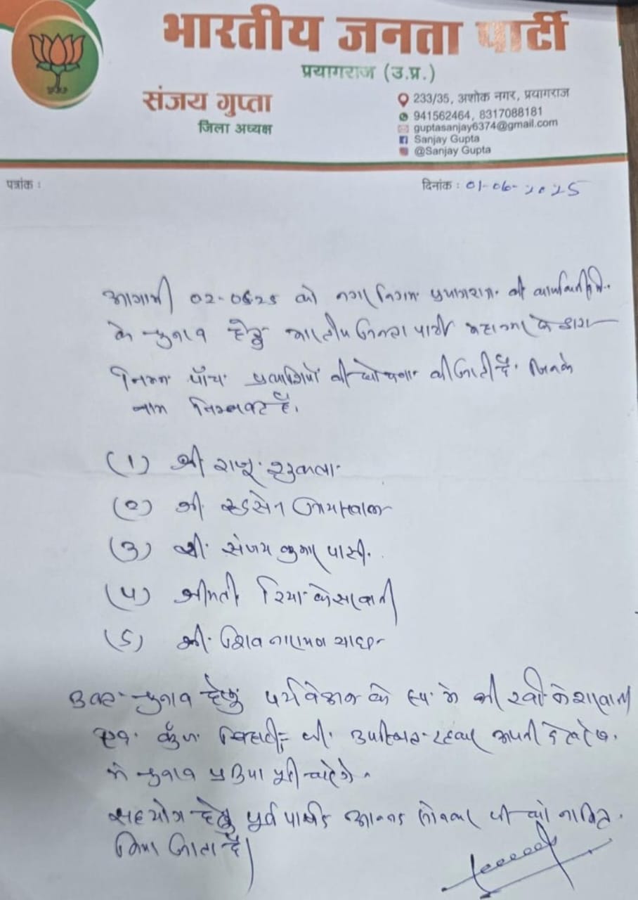 भारतीय जनता पार्टी सिविल लाइन कार्यालय में 2 जून को होने वाले नगर निगम प्रयागराज कार्यकारिणी समिति के सदस्य के चुनाव के हेतु कोर कमेटी की बैठक की गई जिसमें महानगर अध्यक्ष संजय गुप्ता ने नगर निगम प्रयागराज के कार्यकारिणी समिति सदस्य के चुनाव के लिए राजू शुक्ला ,रूद्र सेन जायसवाल , संजय कुमार पासी , रिया केसरवानी एवं शिवनारायण यादव को प्रत्याशी घोषित किया और भाजपा पार्षद दल की सचेतक किरन जायसवाल ने पार्टी के सभी पार्षदों को संगटनात्मक जिम्मेदारी को जिम्मेदारी के साथ निभाने के लिए व्हिप जारी किया