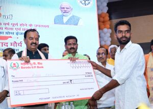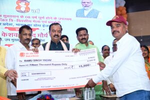 उत्तर प्रदेश खादी तथा ग्रामोद्योग बोर्ड द्वारा ऋण लेकर रोजगार सृजन के क्रम में मण्डल स्तरीय प्रथम, द्वितीय एवं तृतीय पुरस्कार प्राप्त ईकाईयों को क्रमशः पुरस्कार स्वरूप 15000, 12,000 एवं 10,000 की धनराशि का डेमो चेक वितरित किया। उप मुख्यमंत्री ने तीन लोगो को फैमिली आईडी, पांच लोगो को ओडीओपी टूल किट का भी वितरण किया।
