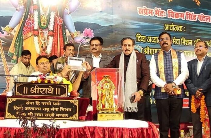 दिव्य अध्यात्म राष्ट्र सेवा मिशन प्रयागराज एवं दिव्य श्री राधा सखी मंडल के संयुक्त तत्वावधान में मुंशी राम प्रसाद की बगिया स्थित नारायण वाटिका, मुट्ठीगंज में आयोजित श्री भक्तमाल कथा के पंचम दिवस पर प्रखर राष्ट्र चिंतक डॉ. अनिरुद्ध जी महाराज ने भक्तों को भक्ति रस का प्रवाह कराया।
