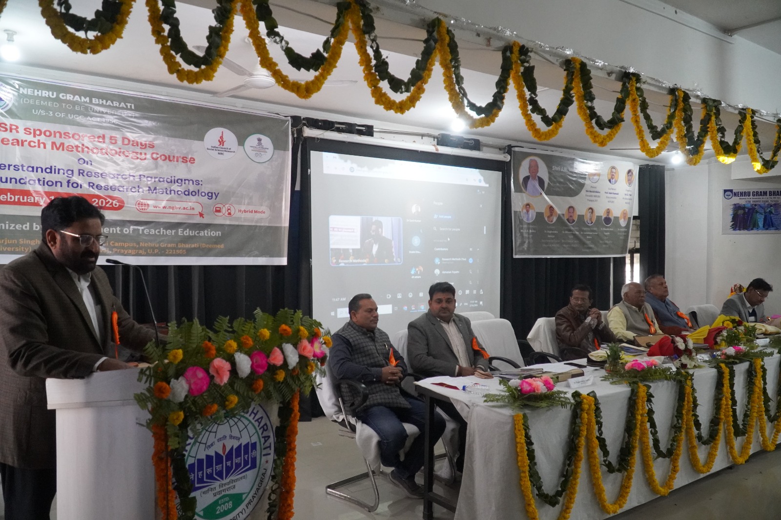 भारतीय सामाजिक विज्ञान अनुसंधान परिषद ,नई दिल्ली द्वारा प्रायोजित पांच दिवसीय रिसर्च मेथाडोलॉजी कोर्स, नेहरू ग्राम भारती मानित विश्वविद्यालय प्रयागराज के शशि परिसर ,शोध केंद्र में उद्घाटन सत्र काे सम्बाेधित करते हुए बताैर मुख्य अतिथि ईश्वर शरण पीजी कॉलेज के प्राचार्य प्राे० आनंद शंकर सिंह ने अपने उद्बोधन में कहा कि सीखने की प्रक्रिया शिक्षा है वही अंडरस्टैंडिंग है। ज्ञान का विस्तार ही शाेध है। हमारा सम्पूर्ण चिंतन हमारे शाेध में कहां है ये भी विचार करना आैर इसका समावेशन करना जरूरी। आपका शाेध भारतीयता काे आत्मसात् करते हुए आगे बढ़ना चाहिये। अध्यक्षीय उद्बोधन में विश्वविद्यालय के कुलपति प्राे० राेहित रमेश ने कहा कि रिसर्च पैराडाइम पर इस तरह के कार्यक्रम शाेध की गुणवत्ता के लिए आवश्यक हैं। शाेधार्थियाें के लिए गहनता से रिसर्च मेथडलॉजी की समझ हाेनी चाहिए।