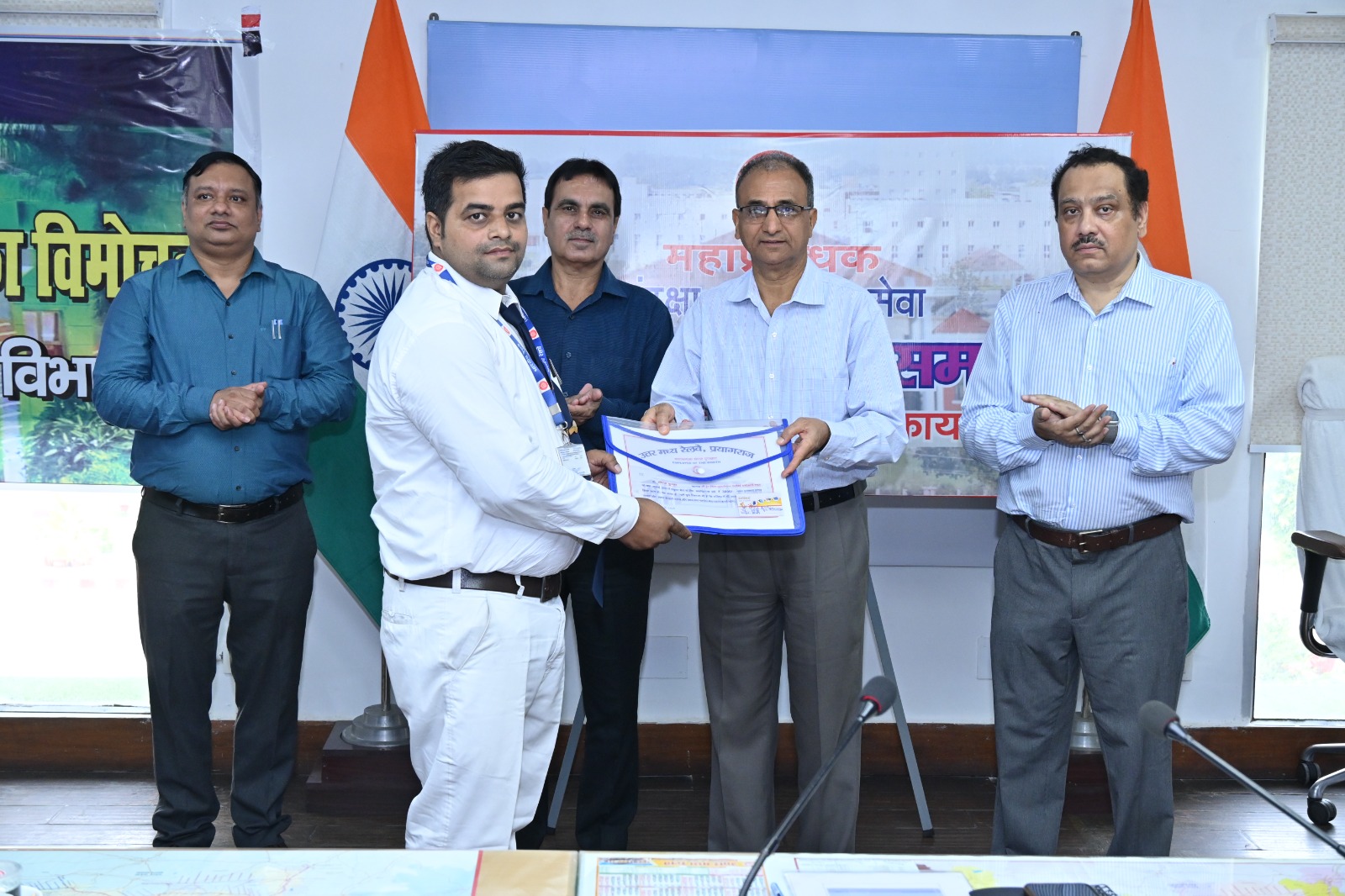 महाप्रबन्धक, उत्तर मध्य रेलवे, उपेन्द्र चन्द्र जोशी, प्रधान मुख्य संरक्षा अधिकारी, जे.सी.एस. बोरा एवं उत्तर मध्य रेलवे के विभागाध्यक्षों की उपस्थिति में संरक्षा के प्रति किए गए उत्कृष्ट कार्यों के लिए झाँसी, आगरा एवं प्रयागराज मण्डलों से जुलाई 2025 माह के लिए चयनित कुल 10 रेल कर्मचारियों को महाप्रबन्धक के द्वारा संरक्षा पुरस्कार प्रदान किए गए।