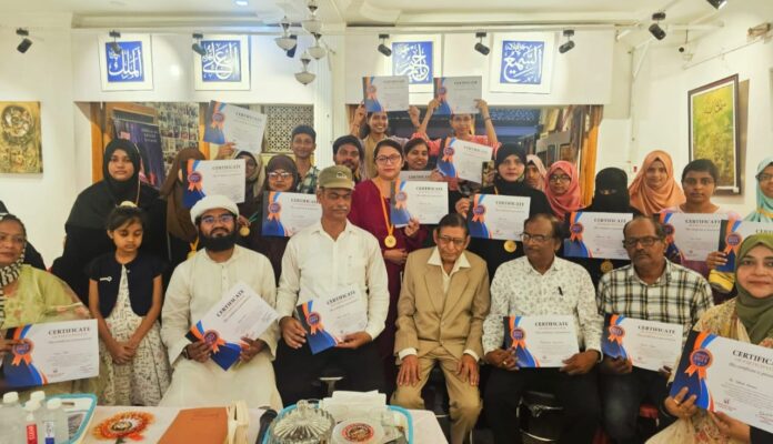 इसके अलावा हैंडमेड वर्क, बुके, प्लांट आदि आर्ट वर्क की भी तारीफ किया। करेली स्थित खानम आर्ट गैलरी में आयोजित तीन दिवसीय राष्ट्रीय कला प्रदर्शनी के दौरान कैलीग्राफी प्रतियोगिता में प्रथम, द्वितीय एवं तृतीय पुरस्कार के साथ सांत्वना पुरस्कार भी दिए गए। कार्यक्रम के संयोजक रवींद्र कुशवाहा और तलत महमूद रहे।