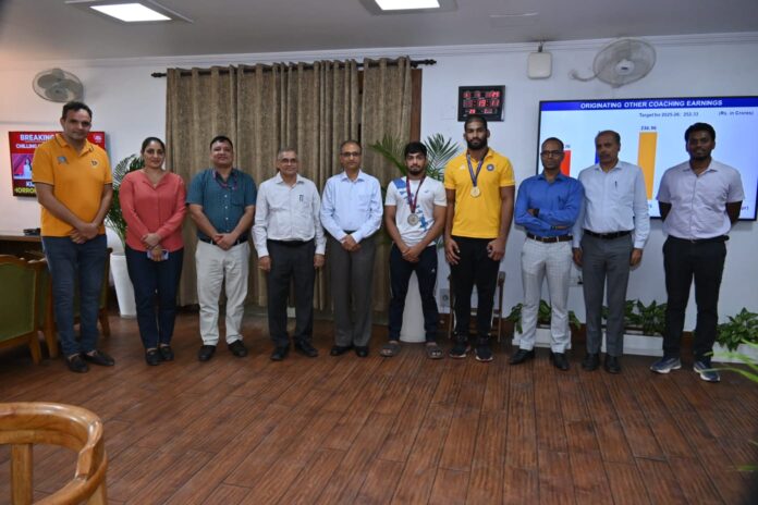 उत्तर मध्य रेलवे के दो पहलवानों उदित एवं जौंटी कुमार ने महाप्रबंधक उत्तर मध्य रेलवे श्री उपेंद्र चंद्र जोशी से मुलाकात की और उनको अपनी उपलब्धियों से अवगत कराया। ज्ञात हो कि, श्री उदित ने फ्रीस्टाइल कुश्ती, भारवर्ग- 57 किलोग्राम एवं 61 किलोग्राम में लड़ते हुए ओमान, जार्डन में आयोजित सीनियर एशियन कुश्ती चैम्पियनशिप, 2025 एवं मंगोलिया में आयोजित सीनियर रैकिंग सीरीज कुश्ती चैम्पियनशिप, 2025 में रजत पदक जीता। इसके पूर्व भी उन्होंने अखिल भारतीय रेलवे पुरुष कुश्ती चैम्पियनशिप, कपूरथला 2024 एवं सीनियर फेडरेशन कप कुश्ती चैम्पियनशिप पंजाब 2024 में स्वर्ण पदक भी जीता था। श्री जोन्टी कुमार ने फ्रीस्टाइल कुश्ती, भारवर्ग- 86 व 97 किलोग्राम में खेलते हुए सीनियर एशियन कुश्ती चैम्पियनशिप, ओमान, जार्डन 2025 में चतुर्थ स्थान, अखिल भारतीय रेलवे पुरुष कुश्ती चैम्पियनशिप, कपूरथला 2024 एवं सीनियर नेशनल कुश्ती चैम्पियनशिप 2024, पूणे (महाराष्ट्र) में स्वर्ण पदक जीत कर राष्ट्र और ज़ोन को गौरवान्वित किया। दोनो ही खिलाड़ी वर्तमान में राष्ट्रीय कैम्प में है और आने वाले वर्ल्ड चैम्पियनशिप में दिनांक 13 से 21 सितम्बर 2025 में भारतीय टीम का प्रतिनिधित्व करेंगे।