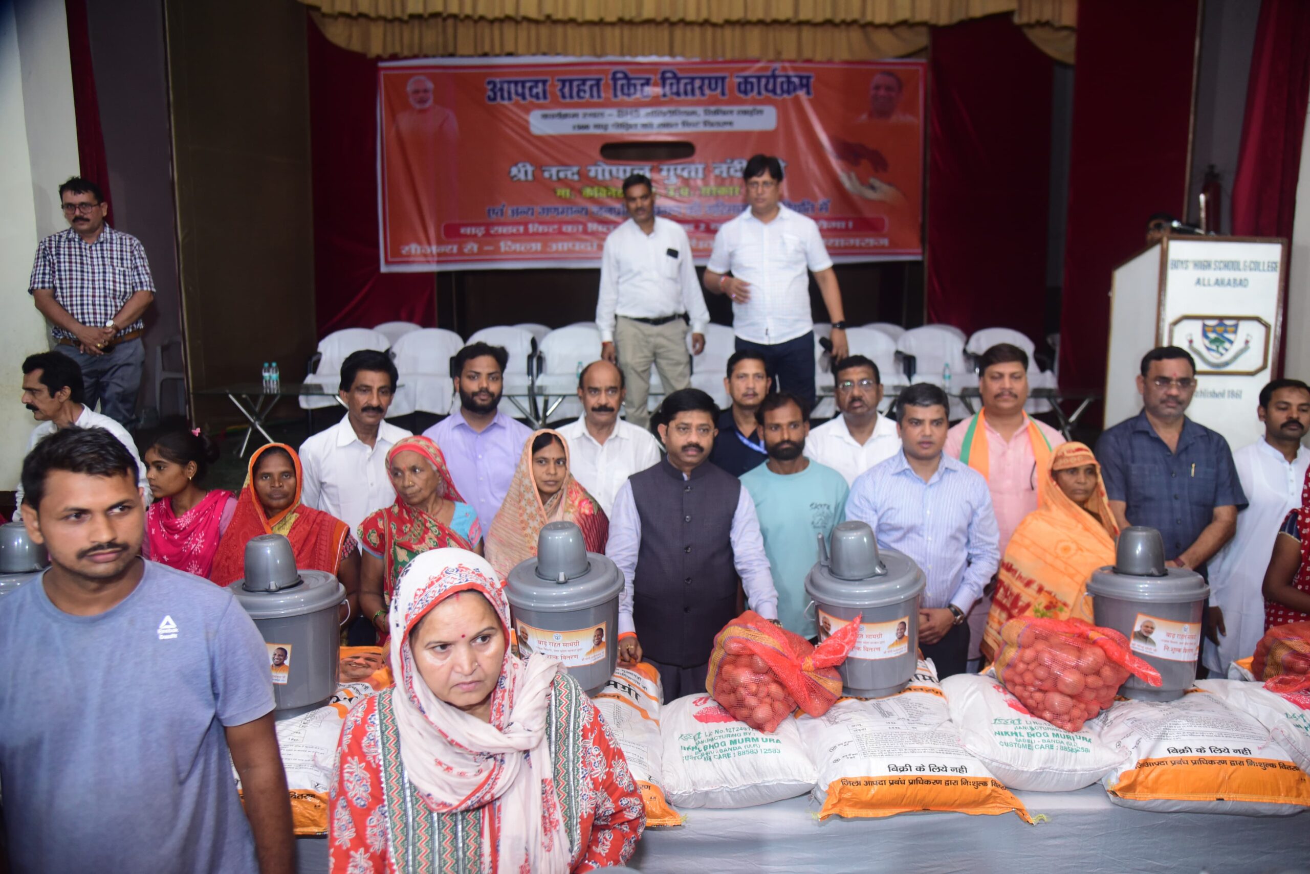 औद्योगिक विकास, मंत्री, उत्तर प्रदेश नन्द गोपाल गुप्ता नंदी ने रविवार को ब्वॉयज हाईस्कूल पहुंचकर बाढ़ प्रभावित लोगो को बाढ़ राहत किट का वितरण किया। इस अवसर पर मंत्री नंन्द गोपाल गुप्ता नंदी की उपस्थिति में बाढ़ से प्रभावित 1500 लोगो को राशन किट का वितरण किया गया तथा तालाबों एवं अन्य स्थानों पर पानी में डूबने से मृत हुए 05 लोगो के परिजनों को 04-04 लाख रूपये का डेमो चेक दैवीय आपदा राहत कोष से प्रदान किया गया। राशन किट में आटा-10 किलो, चावल-10 किलो, अरहर दाल-2 किलो, चना-2 किलो0, भुना चना-2किलो, नमक-1किलो, रिफाइंड/सरसो का तेल-1लीटर, बिस्कुट-10पैकेट, हल्दी-200 ग्राम, मिर्च-100ग्राम, सब्जी मसाला-200ग्राम, चीनी-1 किलो, तिरपाल-1पीस, माचिस व मोमबत्ती-प्रत्येक 1पैकेट, नहाने का साबुन-2 अदद, कपड़े धोने का साबुन-2 अदद, सेनेट्री पैड-20 अदद, डिस्पोजेबल बैग-20 अदद, डेटाल/सेवलॉन-100 एमएल-1 पीस, सूती कपड़ा-1 मीटर, तौलिया-1 पीस, लाई-2.5 किलो, 18 लीटर की ढक्कनदार बाल्टी- 1पीस, आलू-10 किलो, मग-1 अदद, जैसी जरूरी वस्तुएं है।