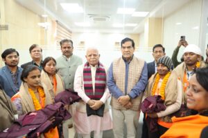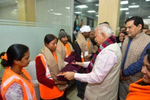 केंद्रीय मंत्री मनोहर लाल खट्टर ने सोमवार को प्रयागराज नगर निगम में सफाई कर्मचारियों को माला पहनाकर और शॉल ओढ़ाकर उन्हें सम्मानित किया। इस दौरान सफाई कर्मचारियों को किट और ट्रैक सूट भी वितरित किया। इसके साथ ही प्रदेश के नगर विकास मंत्री एके शर्मा और महापौर गणेश केसरवानी के साथ स्मार्ट सिटी बिल्डिंग का दौरा किया।