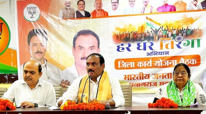 हर घर तिरंगा अभियान को लेकर बुधवार को सिविल लाइन स्थित भाजपा कार्यालय में आहुत बैठक में भाजपा प्रयागराज महानगर अध्यक्ष संजय गुप्ता ने अभियान की जानकारी देते हुए बताया कि प्रदेश व केंद्र नेतृत्व द्वारा हर घर तिरंगा अभियान को लेकर जिलों के लिए कार्ययोजना तैयार की गई है। जिसके तहत प्रयागराज महानगर के सभी 15 मंडलों में तिरंगा यात्रा निकाली जाएगी। कार्यक्रम को लेकर प्रत्येक मंडल में एक संयोजक दो सह संयोजक बनाए गए हैं 7 व 8 अगस्त को अभियान को लेकर मंडल स्तर पर बैठक आहूत की जाएगी। 10 से 12 अगस्त तक प्रत्येक मंडलों में तिरंगा यात्रा का आयोजन किया जाएगा। यात्रा में युवा मोर्चा व महिला मोर्चा की प्रमुख भूमिका, व्यापारियों आम लोगों युवाओं महिलाओं को जोड़ना प्राथमिकता होनी चाहिए। आधुनिक रक्षा उपकरणों की फोटो के प्ले कार्ड्स भी यात्रा में रहेगी। मंडलों में युद्ध में बलिदान हुए सैनिकों के परिजनों का सम्मान उनके घर जाकर किया जाएगा। 12 से 14 अगस्त तक स्वतंत्रता आंदोलन से जुड़े महत्वपूर्ण स्मारकों के आस पास स्वच्छता अभियान चलाकर पुष्पार्चन किया जाएगा। 13 से 15 अगस्त तक झंडे का वितरण एवं घरों में झंडा लगाने का कार्यक्रम चलाया जाएगा। 14 अगस्त को विभाजन विभीषिका स्मृति दिवस पर जिला कार्यालय में संगोष्ठी का आयोजन व उसके बाद मौन जुलूस निकाला जाएगा एवं विभाजन में प्रभावित परिवारों को संगोष्ठी में आमंत्रित किया जाएगा। महानगर अध्यक्ष ने कहा कि कार्यकर्ता 15 अगस्त को अपने घरों में झंडा लगाते हुए उसकी फोटो सरल एप पर लोड करें। महानगर अध्यक्ष ने लोगों से अपील की है कि हर घर तिरंगा अभियान में बढ़ चढ़ कर हिस्सा लें। युवा मोर्चा महानगर अध्यक्ष पप्पू पांडेय को अभियान का संयोजक एवं अविनाश दुबे व दिलीप केसरवानी को सह संयोजक बनाया गया है। बैठक का संचालन महानगर महामंत्री रवि केसरवानी ने किया। कुंज बिहारी मिश्रा, शशि वार्ष्णेय, देवेश सिंह, मुरारी लाल अग्रवाल, प्रमोद मोदी, आनंद सोनकर, मनोज कुशवाहा, राजू पाठक, विजय श्रीवास्तव, प्रवक्ता पवन श्रीवास्तव, राजेश केसरवानी, सह मीडिया प्रभारी विवेक मिश्रा आदि उपस्थित रहे।
