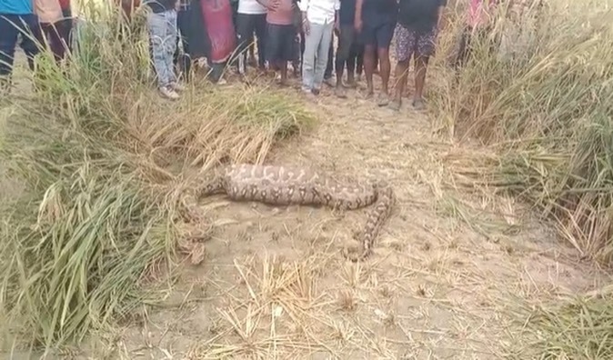 गांव के लोग इकट्ठा हो गए। ग्रामीणों ने 112 नंबर पर सूचना दी। वन विभाग की टीम मौके पर पहुंचकर अजगर को पकड़कर कब्जे में ले लिया। वन विभाग के अल्पेश कुमार, सुरेश कुमार, मनोज कुमार ने बताया कि यह अजगर काफी विशाल और बड़ा है। यह नीलगाय के बच्चे को निगल गया। नीलगाय के बच्चे की मौत हो गई। टीम ने बताया कि अजगर को दूर जंगल में छोड़ दिया जाएगा। गांव के लाइमैन महेंद्र कुमार यादव ने बताया कि यह अजगर धान के खेत में कई दिनों से दिखाई दे रहा था। इस वजह से वह लोग खेत की तरफ जाना छोड़ दिया था।