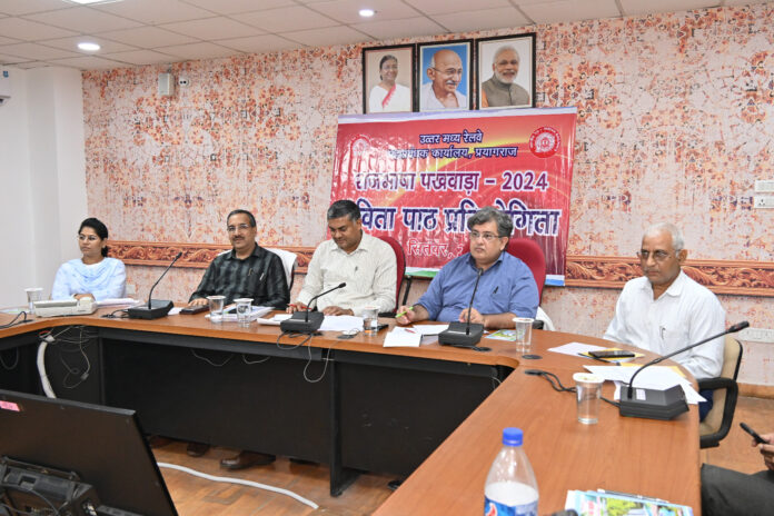 उत्तर मध्य रेलवे के मुख्यालय में 13 सितंबर से आयोजित राजभाषा पखवाड़े के अंतर्गत आज ”स्वरचित कविता पाठ प्रतियोगिता” का आयोजन किया गया। इस प्रतियोगिता में महाप्रबंधक कार्यालय सहित मंडलों एवं कारखानों के विभिन्न विभागों में कार्यरत कर्मचारियों ने अत्यंत उत्साहपूर्वक भाग लिया। प्रतियोगिता में भाग लेने वाले प्रतिभागियों ने समसामयिक एवं सामाजिक सरोकार से संबंधित विषयों पर गीत, गजल एवं कविताएं प्रस्तुत की।