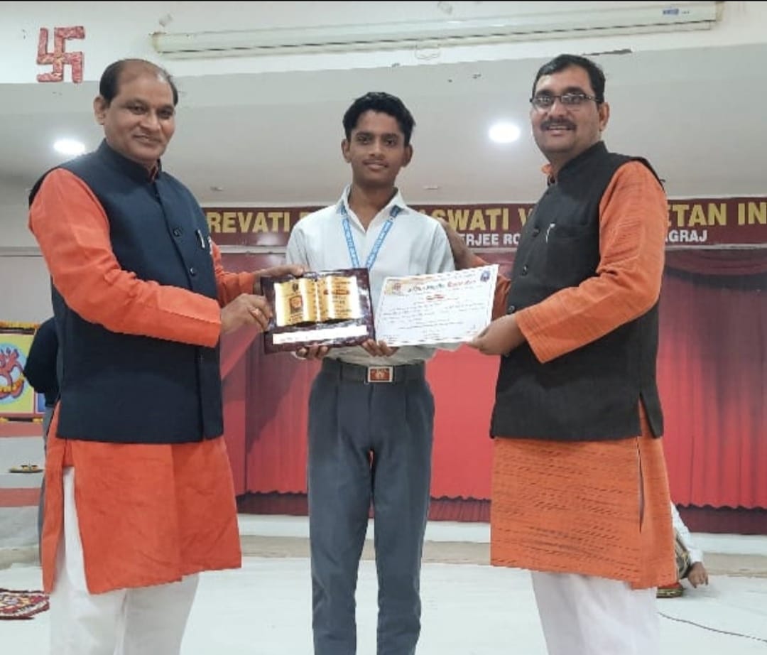 प्रयागराज l विद्या भारती से संबद्ध काशी प्रांत के रानी रेवती देवी सरस्वती विद्या निकेतन इंटर कॉलेज, राजापुर के कक्षा एकादश के छात्र श्लोक त्रिपाठी ने विद्या भारती अखिल भारतीय शिक्षा संस्थान द्वारा सरस्वती बालिका उच्च माध्यमिक विद्या मंदिर, जवाहर नगर, जयपुर (राजस्थान) में आयोजित अखिल भारतीय विज्ञान मेले में काशी प्रांत तथा पूर्वी उत्तर प्रदेश क्षेत्र के प्रतिनिधि के रूप में नैनो टेक्नोलॉजी, मॉडल आधारित प्रतियोगिता (तरुण वर्ग) में स्वर्ण पदक प्राप्त करके विद्यालय, प्रबंध समिति तथा पूर्वी उत्तर प्रदेश क्षेत्र एवं परिवार का मान बढ़ाया l भैया की इस उपलब्धि पर विद्यालय के प्रधानाचार्य एवं क्षेत्रीय विज्ञान प्रमुख बांके बिहारी पाण्डेय ने वंदना सभा में छात्र-छात्राओं के समक्ष भैया श्लोक त्रिपाठी को सम्मानित करते हुए समस्त छात्र-छात्राओं को भी प्रेरित किया कि आप सभी इसी तरह की उपलब्धि प्राप्त कर विद्यालय एवं अपने परिवार का मान बढ़ाएं l