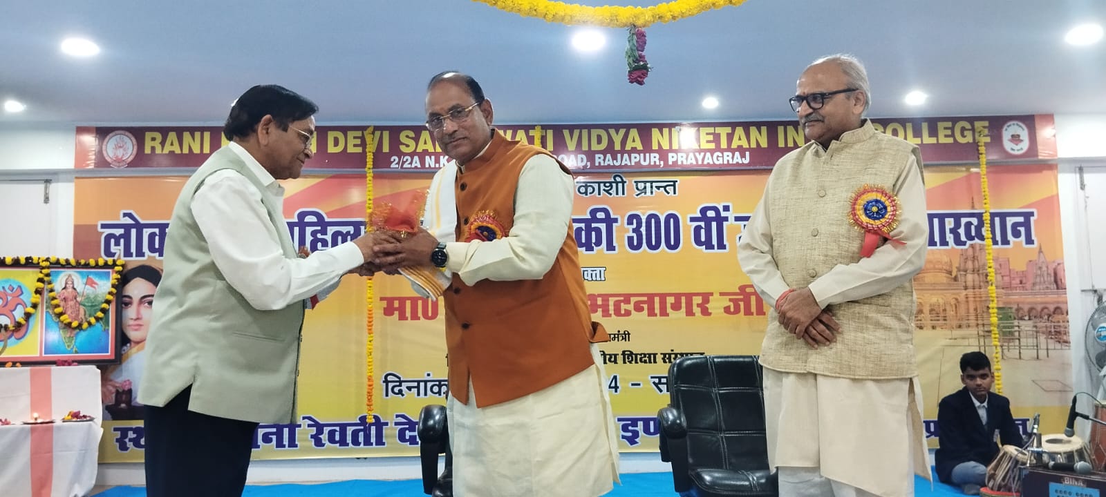 प्रयागराज विद्या भारती से संबंध लयबद्ध काशी प्रांत के रानी रेवती देवी सरस्वती विद्या निकेतन इंटर कॉलेज राजापुर प्रयागराज में प्रधानाचार्य बांके बिहारी पाण्डेय के नेतृत्व में विद्या भारती काशी प्रांत द्वारा लोकमाता अहिल्याबाई होल्कर जी की 300वीं जयंती पर व्याख्यान आयोजित किया गया, इस कार्यक्रम में मुख्य अतिथि एवं मुख्य वक्ता के रूप में विद्या भारती के अखिल भारतीय महामंत्री अवनीश भटनागर एवं अध्यक्ष के रूप में पूर्व सचिव माध्यमिक शिक्षा परिषद एवं वर्तमान में विद्या भारती पूर्वी उत्तर प्रदेश क्षेत्र के अध्यक्ष दिव्यकांत शुक्ल रहे l