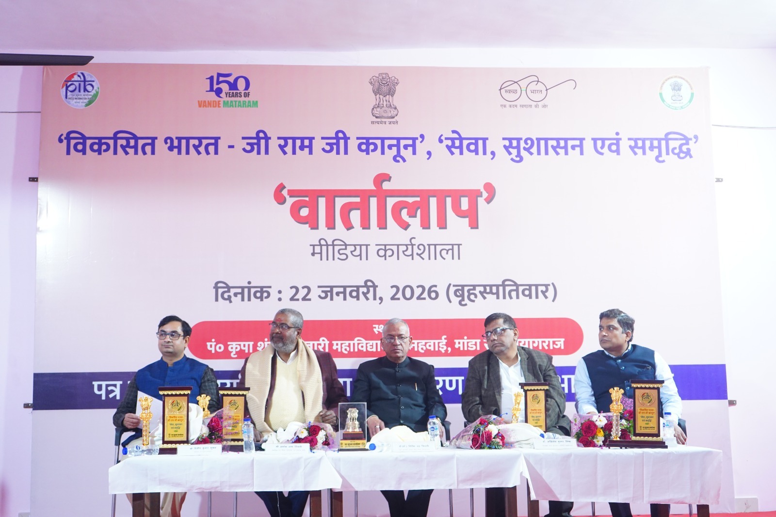 पत्र सूचना कार्यालय, लखनऊ द्वारा गुरुवार को प्रयागराज जिले की मेजा तहसील स्थित पंडित कृपाशंकर तिवारी महाविद्यालय में ‘वार्तालाप कार्यक्रम’ (ग्रामीण मीडिया कार्यशाला) का आयोजन किया गया। कार्यशाला में हाल ही में भारतीय संसद द्वारा बनाए गए ‘विकसित भारत – जी राम जी कानून’ तथा केंद्र सरकार की विभिन्न जनकल्याणकारी योजनाओं, नीतियों और वर्ष 2047 तक भारत को विकसित राष्ट्र बनाने के संकल्प पर विस्तृत चर्चा की गई। कार्यक्रम में बड़ी संख्या में स्थानीय पत्रकारों ने सहभागिता की।