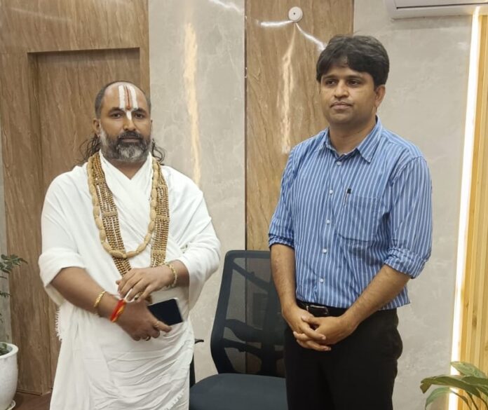 जगद्गुरु स्वामी नारायणाचार्य शांडिल्य जी महराज श्रृंगवेरपुर धाम आज महाकुंभ के मेलाधिकारी विजय किरन आनंद से कार्यालय में मिले। जगद्गुरु स्वामी नारायणाचार्य शांडिल्य जी महराज ने मेलाधिकारी विजय किरन आनंद को महाकुंभ 2024-25 के विश्व प्रसिद्ध आयोजन के सकुशल संपन्न होने के लिए आशीर्वाद दिया। उन्होंने कहा कि जिस तरह से महाकुंभ की व्यापक स्तर पर तैयारियां चल रही है उससे यह आयोजन दिव्य और भव्य होगा। जगद्गुरु स्वामी नारायणाचार्य शांडिल्य जी महराज ने कहा कि इस बार जिस तरह से केन्द्र सरकार, प्रदेश सरकार और महाकुम्भ मेला प्रशासन के अफसर तैयारियों में लगे हैं उसे देखने से लग रहा है कि महाकुम्भ की सभी तैयारियां समय से पूरी होगी और उसका लाभ सभी स्नानार्थियों, श्रद्धालुओं, संत – महात्माओं और प्रयागराज सहित आसपास के जिले के लाखों लोगों को मिलेगा। जगद्गुरु स्वामी नारायणाचार्य शांडिल्य जी महराज ने कहा कि सरकार जिस तरह से सनातन धर्म के मंदिरों को संरक्षित कर रही है उससे सनातन धर्म के लोगों और संत, महात्माओं में हर्ष व्याप्त है। महाकुंभ के मेलाधिकारी विजय किरन आनंद ने बताया कि महाकुंभ की सभी तैयारियां समय से गुणवत्तापूर्ण होगी। उन्होंने कहा कि मेला प्रशासन, लोनिवि, पीडीए, नगर निगम, पर्यटन विभाग सहित अन्य विभागों के कार्य गुणवत्ता सहित तेजी से चल रहे हैं जो समय से पूर्ण होंगे। इस दौरान जगद्गुरु स्वामी नारायणाचार्य शांडिल्य जी महराज ने मेलाधिकारी विजय किरन आनंद को कई जरूरी सुझाव दिया, जिसे मेलाधिकारी विजय किरन आनंद ने गंभीरता से सुना। इस दौरान वरिष्ठ समाजसेवी राजीव कुमार मिश्र सहित अन्य प्रमुख लोग थे।