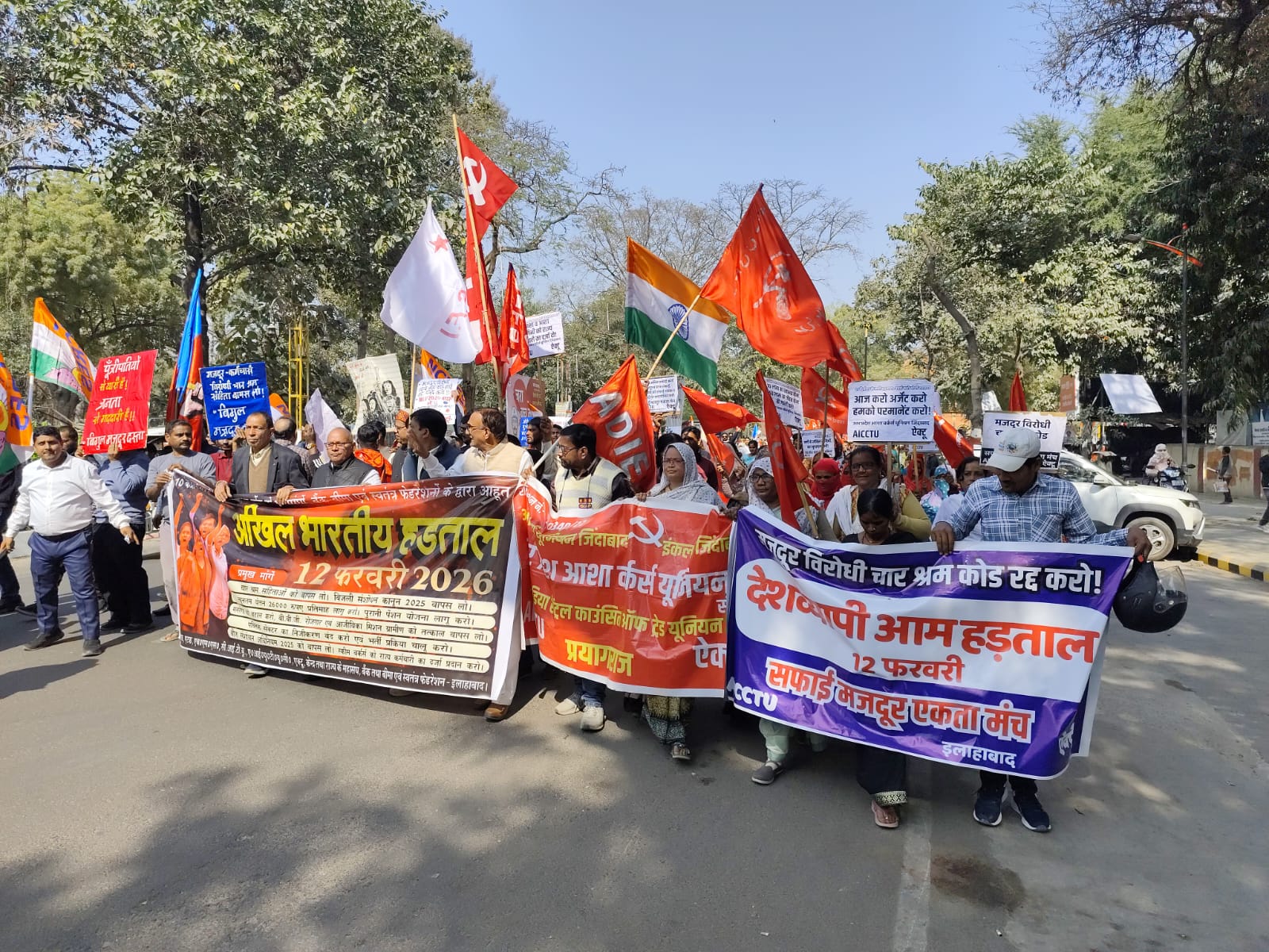 देशव्यापी आम हड़ताल के समर्थन में सफाई मजदूर एकता मंच (ऐक्टू) ने गुरुवार को तेलियरगंज से नगर निगम प्रयागराज तक जुलूस निकाला। इसके बाद कार्यकर्ता पत्थर गिरिजाघर पर आयोजित संयुक्त ट्रेड यूनियन की सभा में शामिल हुए और अपनी मांगों को लेकर प्रदर्शन किया।