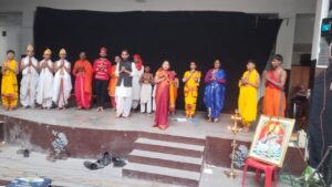 प्रयागराज। 23 मार्च, 2024 को उत्तर प्रदेश संस्कृत संस्थानम् लखनऊ सत्र 2023-24 के तत्त्वावधान में शहर की सुप्रसिद्ध नाट्य संस्था “स्पर्श फिजिकल आर्ट एण्ड कल्चर” द्वारा स्वामी विवेकानन्द विद्याश्रम इंटर कॉलेज के सहयोग से संस्कृत भाषा की नाट्य कार्यशाला के अंतर्गत नाट्य प्रस्तुति “भारतवर्ष” का मंचन किया गया। नाट्य प्रस्तुति की शुरुआत सबसे पहले संस्थान के संरक्षक एवं प्रस्तुति नियंत्रक वरिष्ठ ने की रंगकर्मी हर्ष पाण्डेय ने सरस्वती वंदना की तथा द्वीप प्रज्ज्वलित कर मुख्य अतिथि विद्यालय के प्रबंधक विजय कुमार तिवारी, विशिष्ट अतिथि अजय मिश्र ने मंच पर फूलों का गुलदस्ता देकर नाट्य प्रस्तुति की शुरुआत की। प्रस्तुति जो इस प्रकार है. बड़ी कठिनाई से और आज के युग में संस्कृत भाषा में नाट्य प्रस्तुति तैयार किया। आपको अवगत कराना है कि यह नाट्य कार्यशाला का प्रशिक्षण प्रारम्भ दिनांक 03 फरवरी से 04 मार्च 2024 को वेद विद्यालय, विश्व हिन्दू परिषद में संचालन हुआ जो कि प्रशिक्षणकर्ता-आचार्य निर्मोही, अजय प्रकाश, हर्ष पाण्डेय, आचार्य सुनील शर्मा के द्वारा संचालन हुआ। इसके उपरान्त आज दिनांक 23 मार्च 2024 को स्वामी विवेकानन्द विद्याश्रम इण्टर कालेज, प्रयागराज में मंचन हुआ।