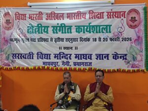 प्रयागराज। विद्या भारती से संबद्ध काशी प्रांत के सरस्वती विद्या मंदिर माधव ज्ञान केंद्र नैनी, प्रयागराज में तीन दिवसीय क्षेत्रीय संगीत कार्यशाला का समापन गरिमामय वातावरण में संपन्न हुआ। कार्यशाला का संयोजन प्रधानाचार्य अजय कुमार मिश्र के निर्देशन में किया गया तथा समापन सत्र की अध्यक्षता विद्या भारती पूर्वी उत्तर प्रदेश के क्षेत्रीय संगठन मंत्री हेमचंद्र जी ने की।