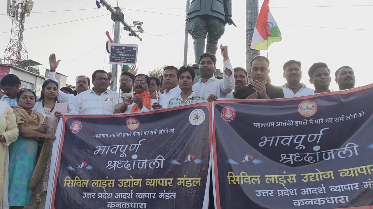 पहलगाम में आतंकवाद की घटना के चलते मारे गए सभी 27 पर्यटकों को सिविल लाइंस उद्योग व्यापार मंडल, कनकधारा एवं आदर्श व्यापार मंडल के द्वारा सादर श्रद्धांजलि एवं उनके परिवार को शोक संवेदना प्रेषित की गई । मृतक आत्माओं की शांति के लिए सभी व्यापारी भाई बहनों ने मिलकर मोमबत्ती जलाकर 1 घंटे का मौन अनशन किया । अध्यक्ष नीरज जायसवाल ने कहा देश के लिए यह आतंकवादी हमला बड़ी त्रासदी है , सरकार जो कदम उठाती है उसमें पूरा भारत साथ है । अध्यक्ष महिला प्रकोष्ठ स्वाति निरखी ने मारे गए 27 पर्यटकों को श्रद्धांजलि देते हुए कहा कि आतंकवाद को खत्म करने के लिए पूरा देश एकजुट है और हम सरकार के साथ है वहीं पार्षद पंकज जयसवाल ने कहा कि स्वयं के स्तर से आतंकवाद को तोड़ने का प्रयत्न अत्यंत जरूरी है ।