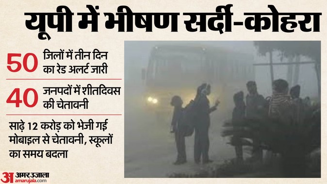 भीषण ठंड और घने कोहरे को देखते हुए राज्य सरकार ने अलर्ट जारी किया है। राहत आयुक्त डॉ. हृषिकेश भास्कर के निर्देश पर सचेत एप के माध्यम से 12.52 करोड़ मोबाइल उपभोक्ताओं को मौसम चेतावनी संदेश भेजा गया। मौसम विभाग ने तीन दिन का बुलेटिन जारी करते हुए 50 जिलों में रेड अलर्ट और 40 जिलों में शीतदिवस की चेतावनी दी है।