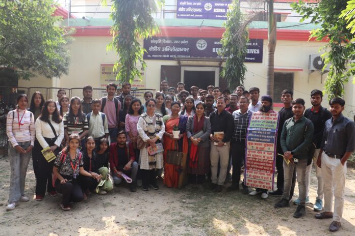 25 नवम्बर, 2024 को विश्व धरोहर सप्ताह के समापन अवसर पर राजकीय पाण्डुलिपि पुस्तकालय तथा क्षेत्रीय अभिलेखागार, संस्कृति विभाग, प्रयागराज द्वारा ईश्वर शरण महाविद्यालय, प्रयागराज के छात्र-छात्राओं का डॉ जमील अहमद के नेतृत्व में शैक्षिक भ्रमण कराया गया। क्षेत्रीय अभिलेखागार में छात्र-छात्राओं को प्रयागराज के नगरीय विकास विषयक अभिलेख प्रदर्शनी तथा मूल अभिलेखों (दस्तावेजों) का अवलोकन कराया गया।