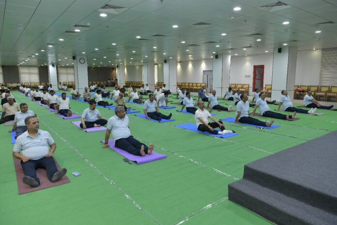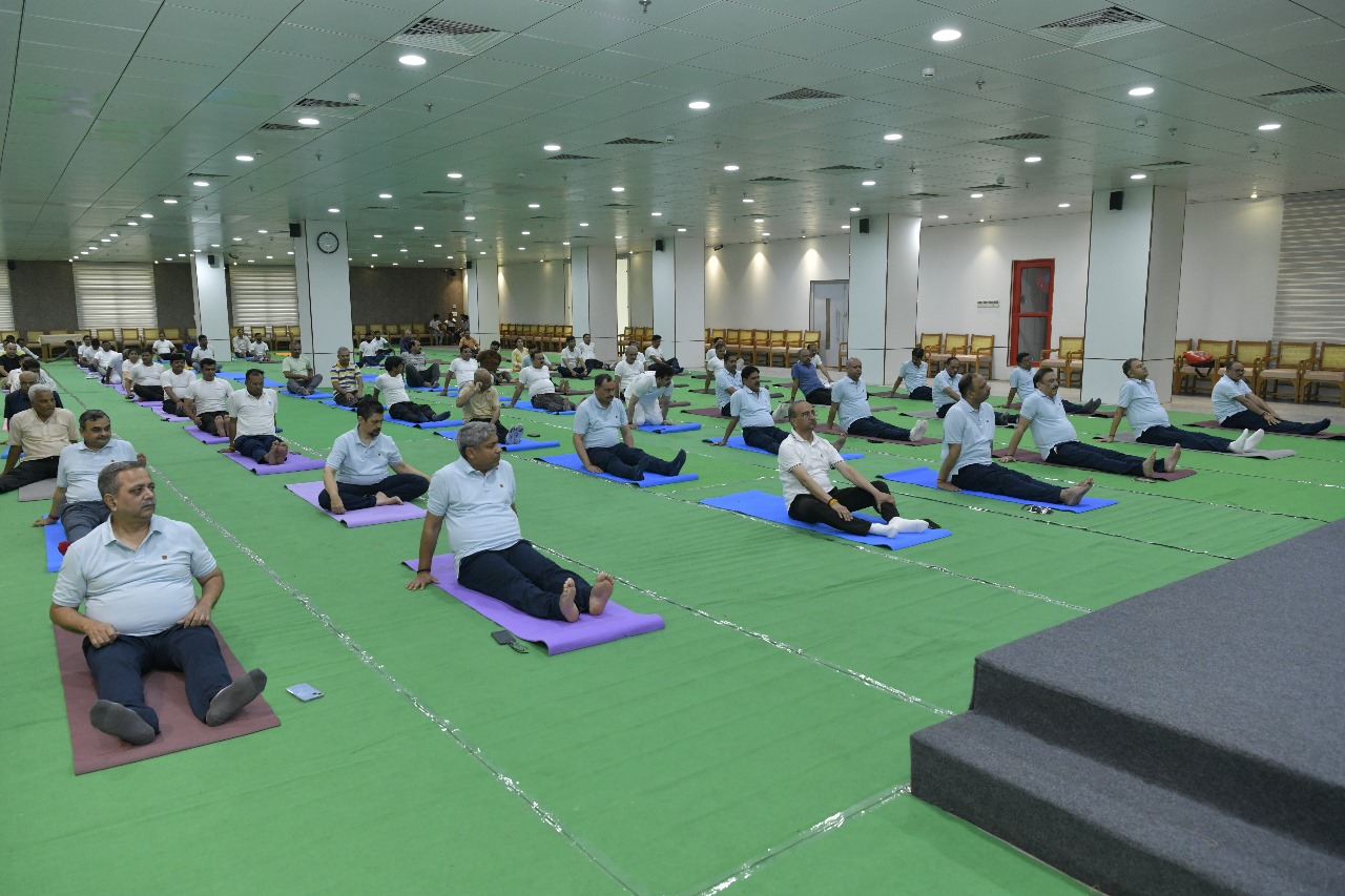 भारत की परंपरागत विरासत योग को जन-जन के आरोग्य का माध्यम बनाये जाने एवं व्यक्तिगत स्वास्थ्य और वैश्विक स्थिरता के उद्देश्य और लोगों के संतुलित, पर्यावरण सचेत जीवन को बढ़ावा देने की भावना के साथ ’’एक पृथ्वी, एक स्वास्थ्य’’ के लिये योग- की थीम पर मनाये जा रहे 11वें अन्तर्राष्ट्रीय योग दिवस के अवसर पर उच्च न्यायालय इलाहाबाद के विधि म्यूजियम के हाल में आयोजित सामूहिक योगाभ्यास कार्यक्रम में न्यायमूर्तिगणों, उच्च न्यायालय के अधिकारियों, विधि अधिकारियों एवं विद्वान अधिवक्तागणों के द्वारा पूरे मनोयोग व उत्साह के साथ योगाभ्यास किया गया। इस अवसर पर उपस्थित मा0 न्यायमूर्तिगणों व अन्य के द्वारा योगा के विभिन्न आसनों का योगाभ्यास व प्राणायाम क्रियाएं की गयी। योग प्रशिक्षक ने सर्वप्रथम वार्मअप कराकर योगाभ्यास का प्रारम्भ किया। तत्पश्चात ग्रीवा संचालन, स्कंध संचालन, कटिचालन, पादहस्थासन, अर्द्धचक्रासन, दण्डासन, वज्रासन, वक्रासन, ताणासन, वृक्षासन व अन्य आसनों के साथ कपालभाति, नाड़ी शोधन, शीतली प्राणायाम, ध्यान मुद्रा, भ्रामरी आदि प्राणायाम कराया तथा इनके महत्व एवं लाभ के बारे में बताते हुए प्रत्येक आसन की विधि व सावधानी के बारे में भी बताया।